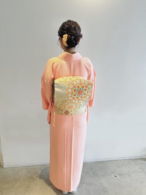 今回の着付けは、お宮参り・入学式・卒業式・結婚式など、幅広いフォーマルシーンに対応できる訪問着スタイル。帯は立体感のある上品な結びに仕上げ、後ろ姿まで美しいシルエットをつくりました。動いても型崩れしにくく、長時間過ごす予定のある方にも安心です。