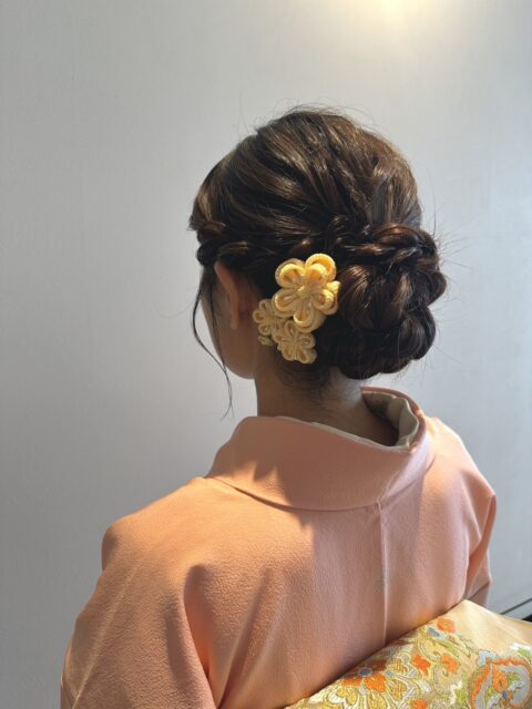 控えめでありながら存在感のあるつまみ細工の髪飾りが目を惹き、横顔やうなじをいっそう女性らしく引き立ててくれます。フォーマルな着物と相性がよく、気品ある印象を演出します。