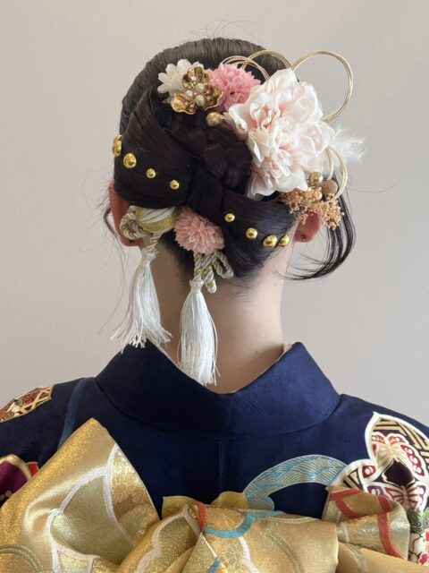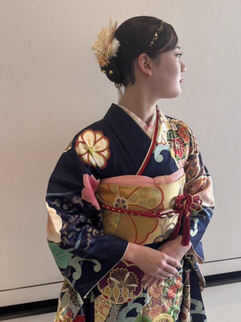 今回ご紹介するのは、濃紺の振袖に金の帯を合わせた、格調高く華やかな成人式スタイル。