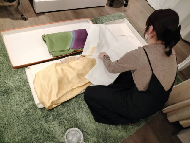 お客様からお預かりした着物や帯、長襦袢、小物類を一点ずつ確認し、足りない物がないか、帯結びの種類に合ったセットが揃っているかを丁寧にチェックしています。この細やかな作業は、当日スムーズに美しく仕上げるための大切なプロセスです。