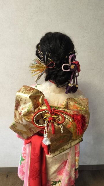 今回は柔らかい編み込みアレンジをベースに、上品な金箔と和飾りをプラス。