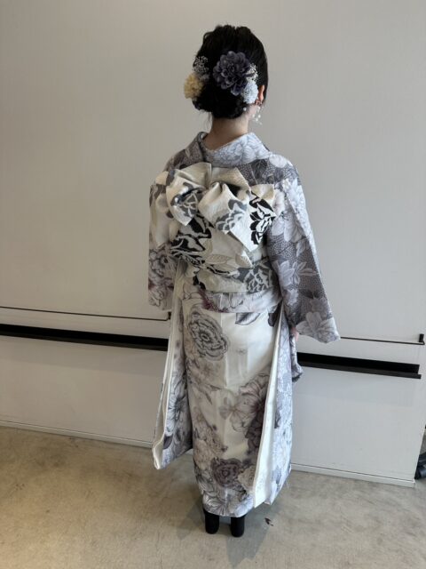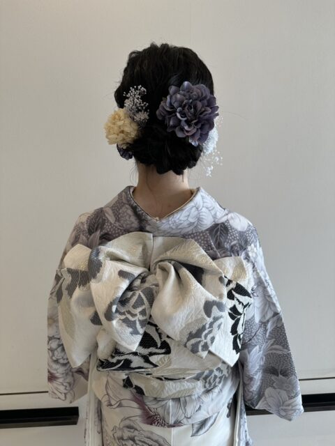 今回ご紹介するのは、グレートーンの振袖に、立体感のある帯結び、そしてくすみカラーの大輪髪飾りを合わせた、大人可愛い和装スタイル。
